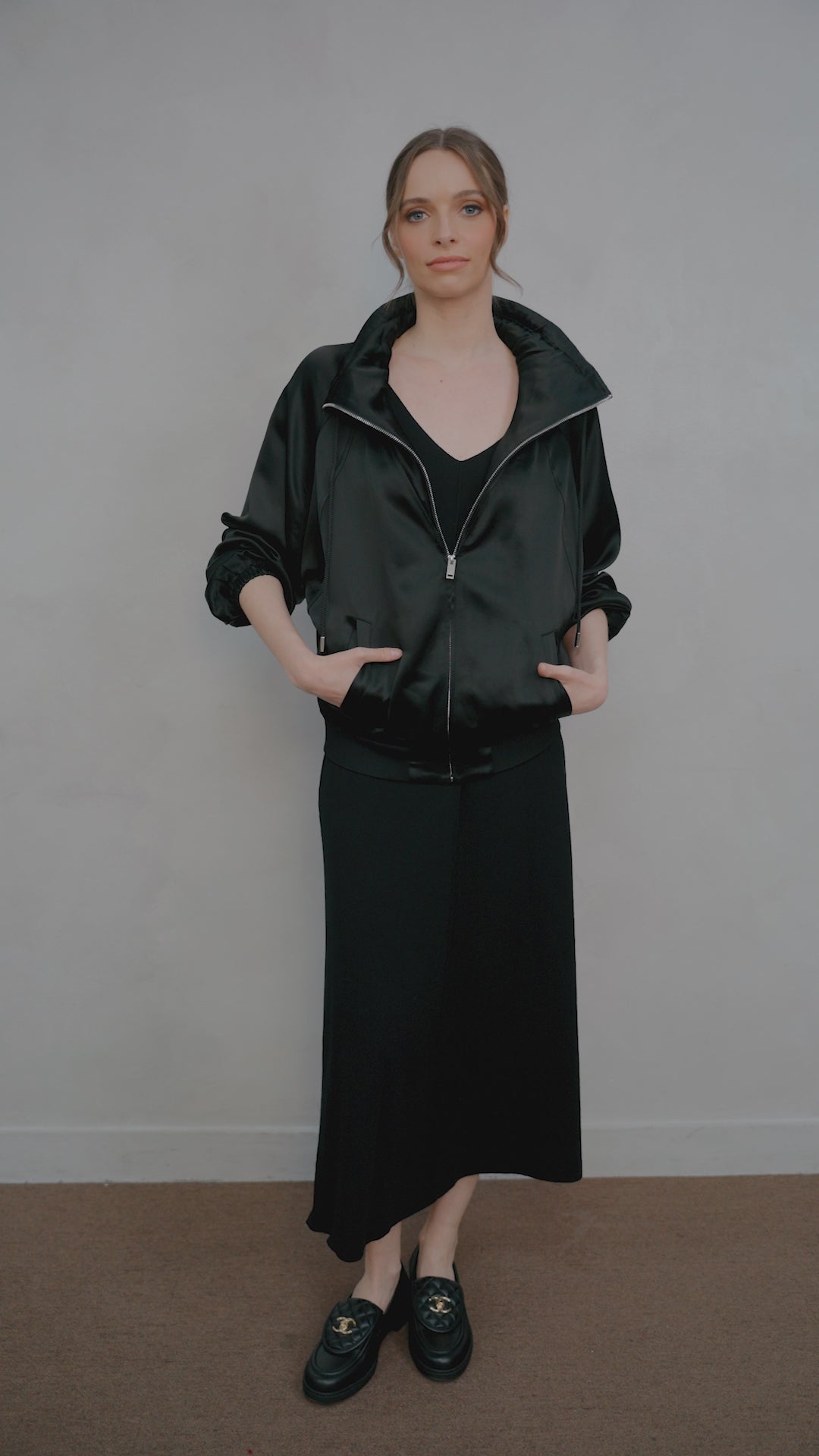 The Satin Storm Full-Zip Jacket brings elevated edge to everyday outerwear. Crafted from sleek satin, this lightweight jacket features a dramatic wide collar that transitions into a structured hood with drawstring details and polished metal toggles. A full front zipper, roomy front pockets, and gently gathered cuffs complete its relaxed yet refined silhouette.
